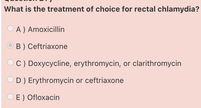 Answer: Doxycycline, erythromycin, or clarithromycin