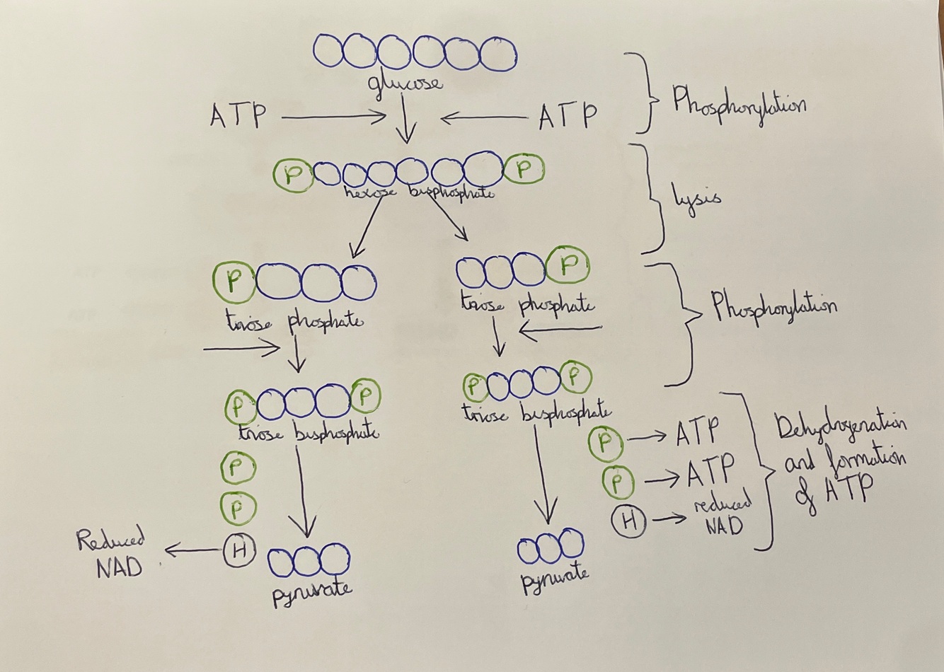 1.Phosphorylation: two phosphates are released from ATP and join to glucose to form hexose bisphosphate