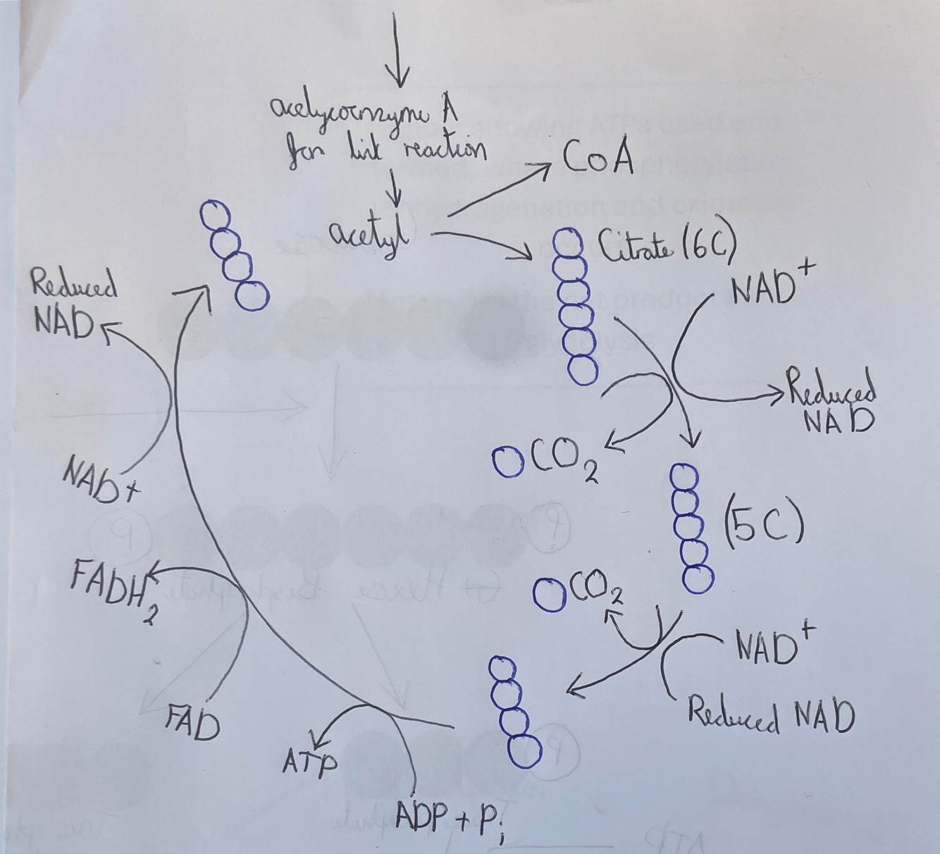 1.Acetyl CoA delivers an acetyl group which combines with oxaloacetate to form a six-carbon citrate