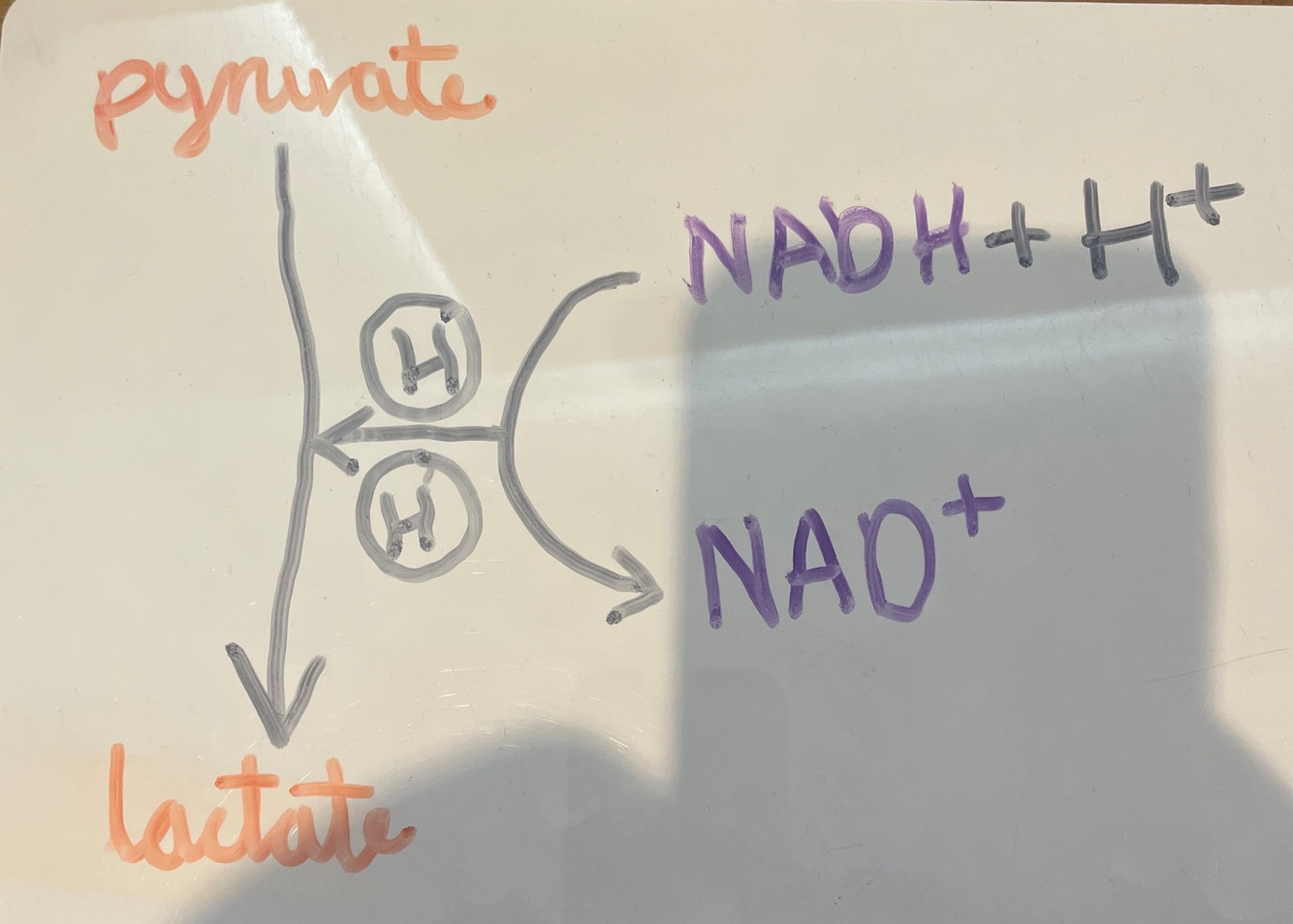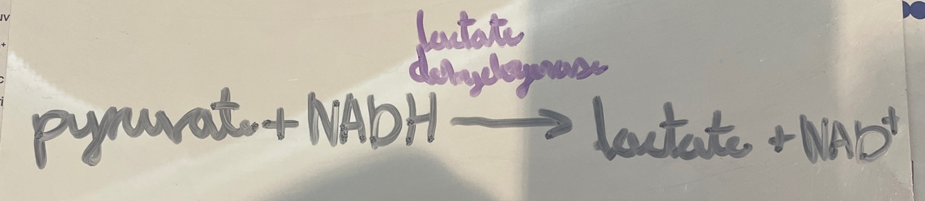 1.Pyruvate acts as a hydrogen acceptor, taking h⁺ from NADH, and is converted into lactate, this is catalysed by the enzyme lactate dehydrogenase