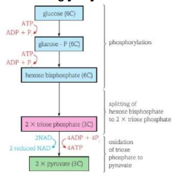 • Anaerobic process • Glucose (6 carbon sugar), split into two smaller pyruvate molecules (3 carbon molecules) • ATP and reduced NAD (nicotinamide adenine dinucleotide) are also produced