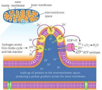 • Outer mitochondrial membrane - separated the contents of the mitochondrion from the rest of the cell, creating a cellular compartment with ideal conditions for aerobic respiration • Inner mitochondrial membrane - contains electron transport chains and ATP synthase • Cristae - projections of the inner membrane which increase the surface area available for oxidative phosphorylation • Intermembrane space - proteins are pumped into this space by the electron transport chain. The space is small, so concentration builds up quickly • Matrix - contains enzymes for the Krebs cycle and the link reaction, also contains mitochondrial DNA