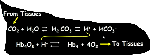 the shift to the right of the oxygen equilibrium curve of both adult and fetal blood in response to an increase in PCO2 or a decrease in pH, or both.