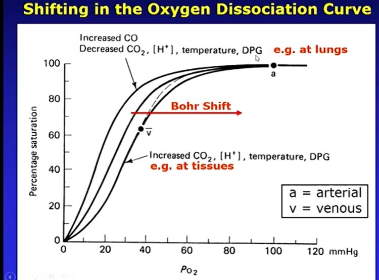 Allosteric effect: when the 1st molecule of O2 binds it turns the haemoglobin molecule to expose the next haem moiety. Same happens with the next O2 molecules. The more molecules are taken up the faster it is. Co-operative binding property.