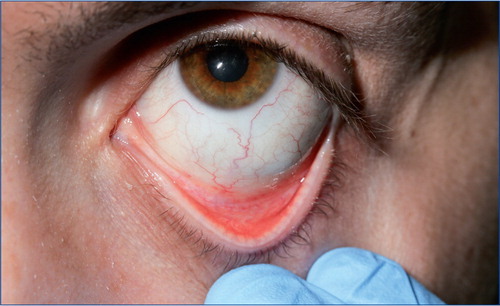 Conjunctival pallor: suggestive of underlying anaemia. Ask the patient to gently pull down their lower eyelid to allow you to inspect the conjunctiva.