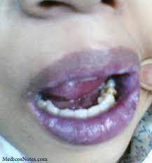 Central cyanosis: bluish discolouration of the lips and/or the tongue associated with hypoxaemia.
