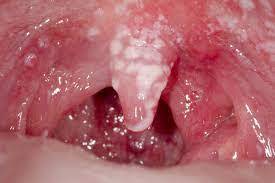Oral candidiasis: a fungal infection commonly associated with steroid inhaler use (due to local immunosuppression). It is characterised by pseudomembranous white slough which can be easily wiped away to reveal underlying erythematous mucosa.