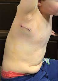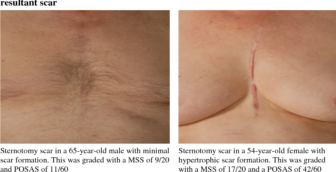 Median sternotomy scar: located in the midline of the thorax. This surgical approach is used for cardiac valve replacement and coronary artery bypass grafts (CABG).