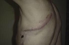 Axillary thoracotomy scar: located between the posterior border of the pectoralis major and anterior border of latissimus dorsi muscles, through the 4th or 5th intercostal space. This surgical approach is used for the insertion of chest drains.