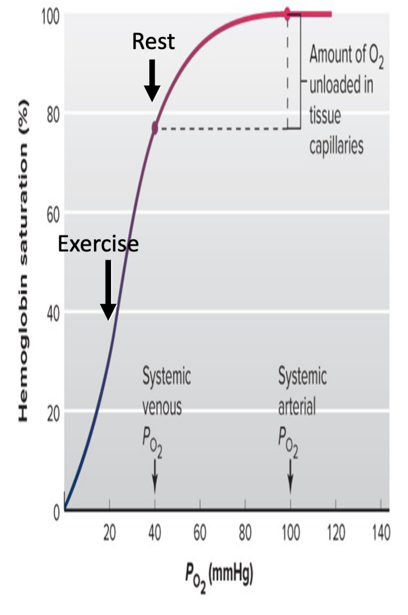 During exercise, the body’s oxygen demand increases, and there’s still enough time in the lungs to ensure that the blood leaving the lungs retains a high partial pressure of oxygen (close to 100 mmHg) and remains nearly fully saturated (around 100%). This is possible because of the plateau portion of the oxygen-hemoglobin saturation curve.