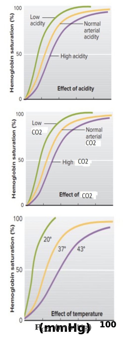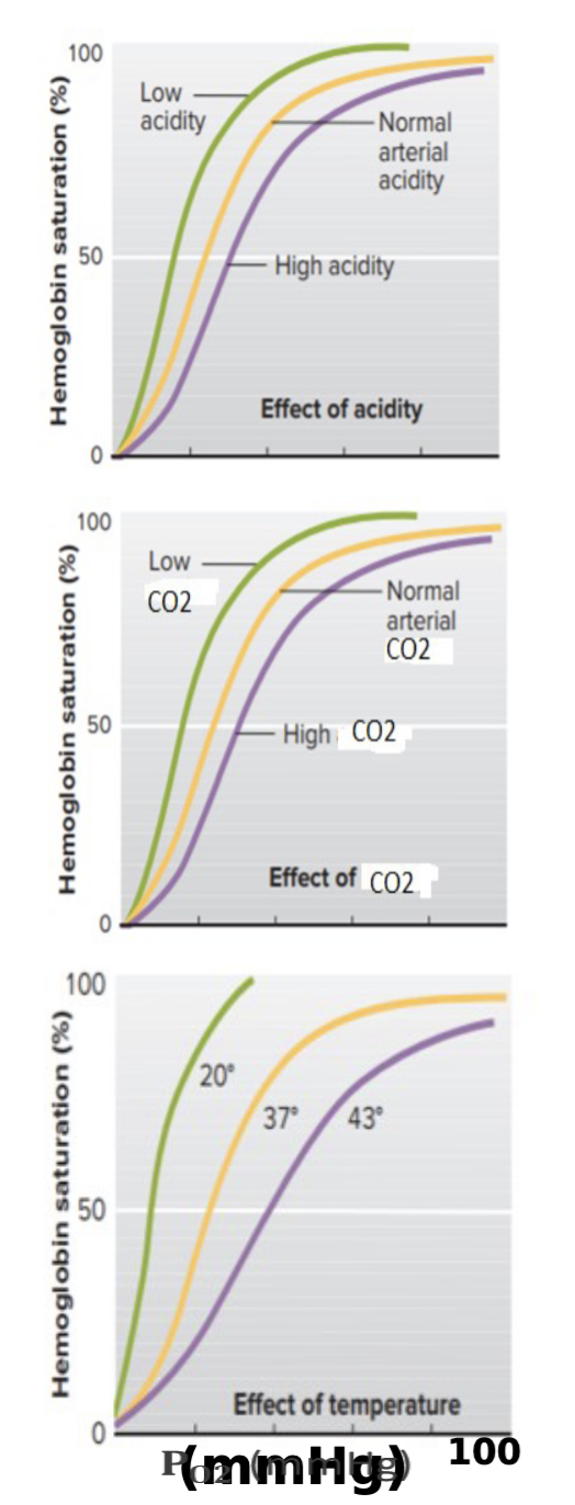 - Less oxygen binds Hb (decreasing Hb-O2 saturation; unloading).