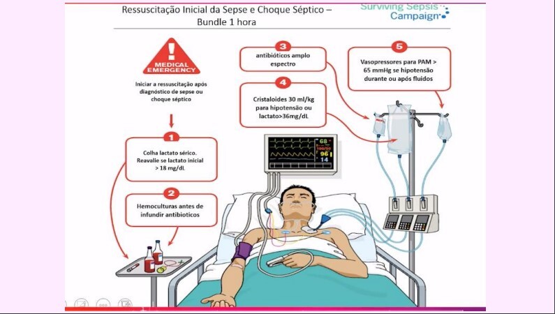 Coletar lactato sérico, gasometria arterial, hemoculturas de dois locais distintos de punção venosa e de todos os dispositivos de acesso, culturas de locais de fácil acesso (por exemplo, expectoração, urina) e imagens de fontes suspeitas.