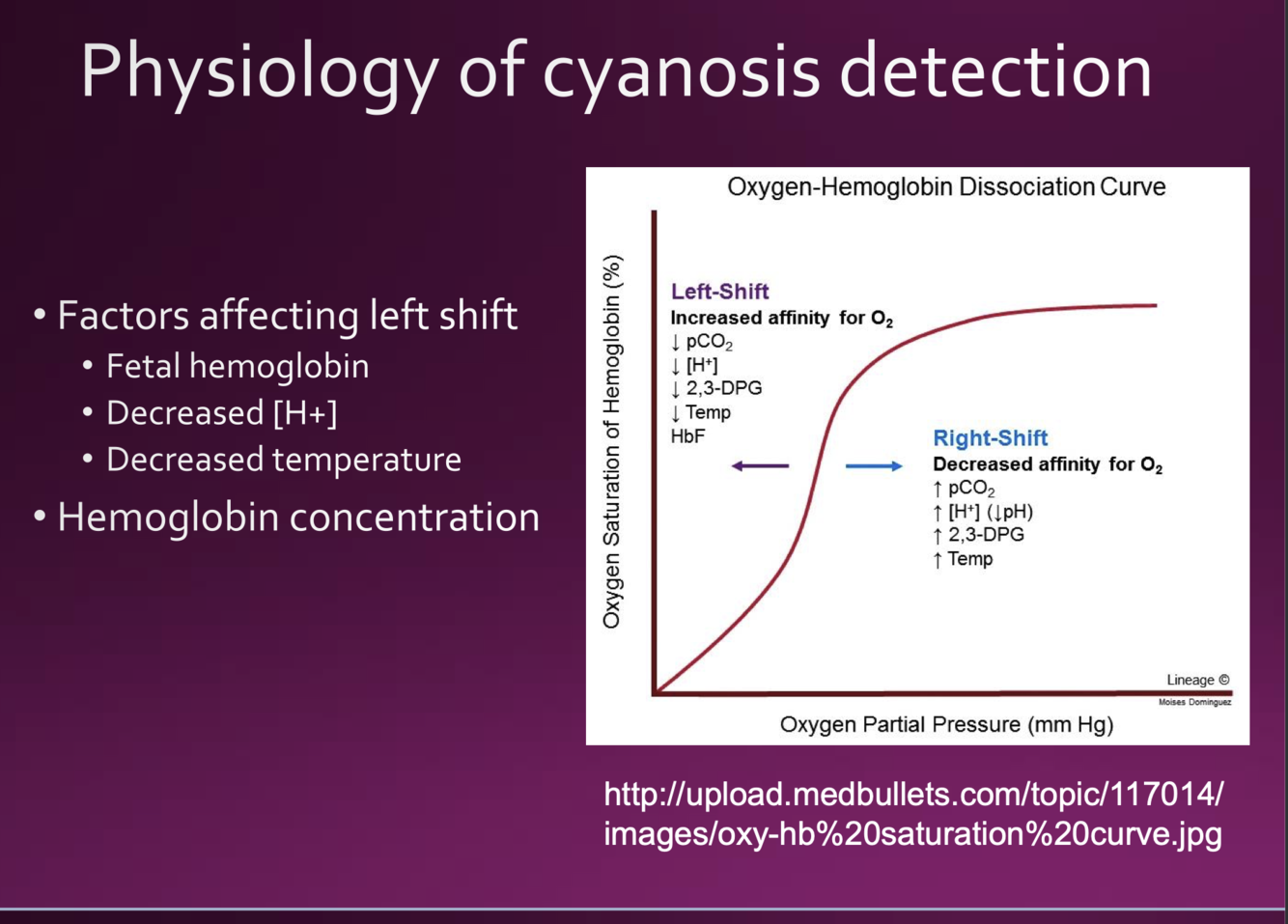 physiology of cyanosis: when the curve shifts __, cyanosis wil occur