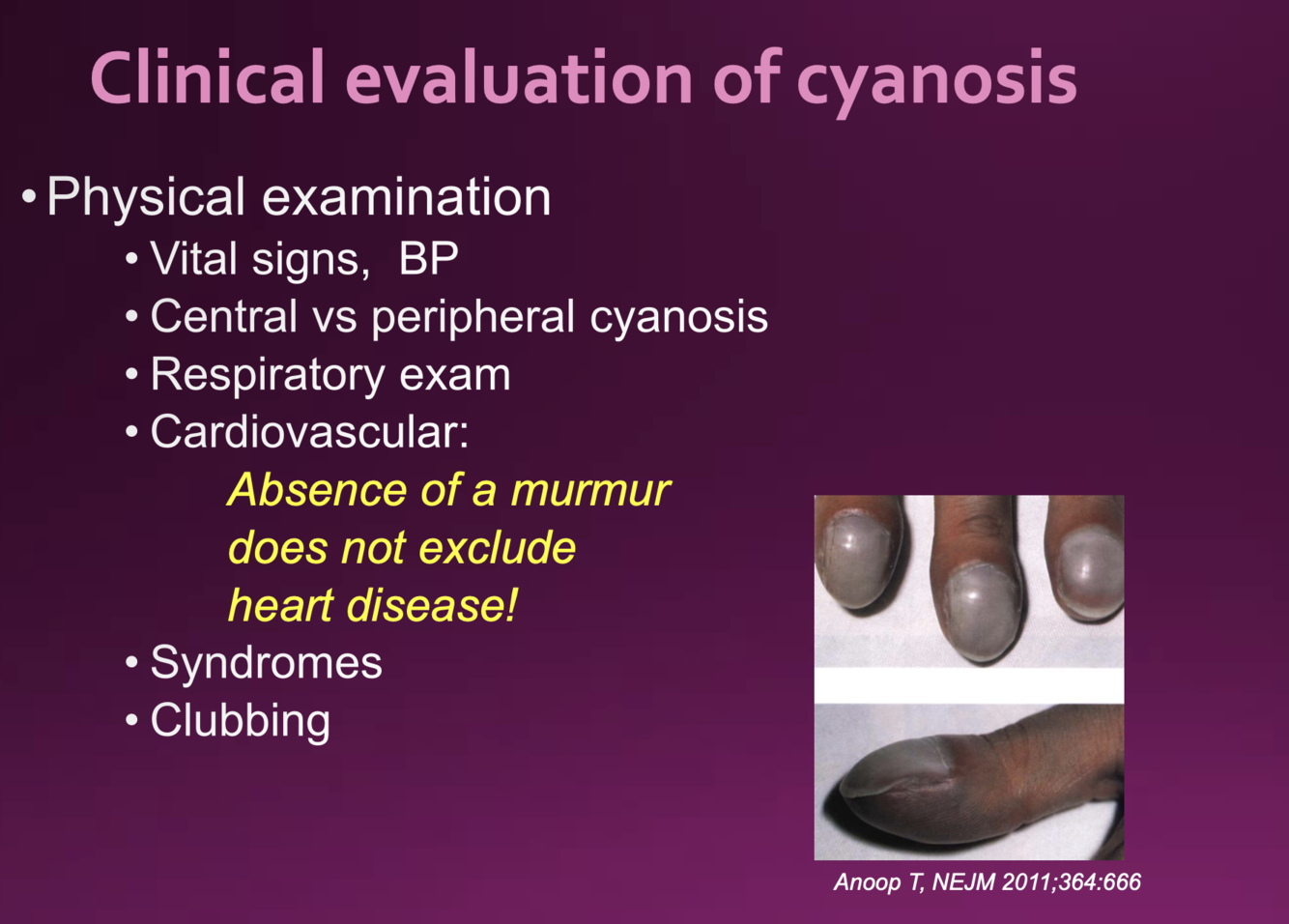 peripheral= acrocyanosis, perioral cyanosis. often normal in otherwise healthy childrne .