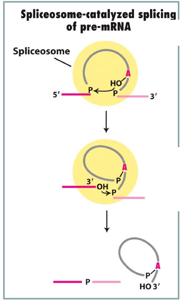 2’ OH of 3’ adenine attacks upstream phosphate, forming a lariat and breaking off 5’ end. That 5’ end OH then attacks phosphate of free 3’ end to close the gap and release the lariat for degradation. These are called transesterification reactions.