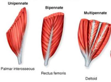 Pennate muscles are muscles which 1/more aponeuroses running through the muscle body from the tendon and fascicles which attach to these aponeuroses obliquely to the direction of movement