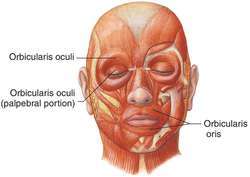 E.g. orbicularis oculi around the eye, orbicularis oris around the mouth