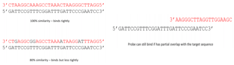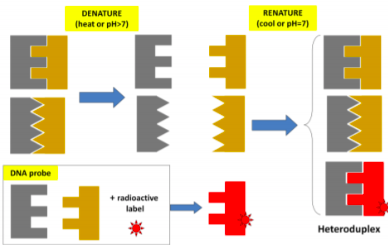 ⇒ Hybridisation of a probe to detect target DNA
