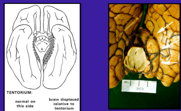 In a tonsillar herniation, the cerebellar tonsils are pushed into the foramen magnum compressing the brainstem