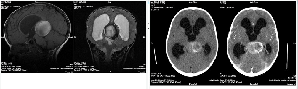 In this case, the pineal region lesion is not a tumor, but a Vein of Galen Malformation. Biopsy or attempt at open resection would be disastrous. This case emphasizes the need to carefully image, and in appropriate cases obtain angiography, for pediatric cases that may involve vascular lesions. Vein of Galen malformations present variably by age. Newborn children typically present in severe congestive heart failure due to high flow shunting through the malformation, and often macrocephaly. Older children may present first with hydrocephalus, usually with a slower flow lesion. Yasargil classified Vein of Galen Malformations in the following manner: 1: pure fistula of ACA or PCA branch to vein of galen, 2: Fistulous thalamoperforating vessels to Vein of Galen, 3: Combined lesions, and 4: Plexiform AVMs. Treatment options include endovascular techniques (both transarterial and transvenous), observation with management of hydrocephalus and rarely, open surgical techniques. Prognosis is related to age at presentation, cardiac status and presence of calcifications in the basal ganglia, as a marker of cererbral injury due to steal. In older children, non-operative management or hydrocephalus management alone can be successful. In this case, angiography showed a slow flow lesion which was seen to thrombose on follow-up studies.