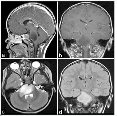 Seorang anak berusia 9 tahun datang ke spesialis anak dengan nyeri kepala dan pertumbuhan terhambat. Hasil patologi anatomi tumor terlihat seperti di gambar. Apakah diagnosis paling mungkin :
