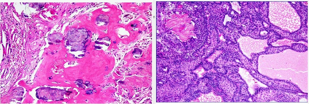 Craniopharyngiomas represent 1-2% of all intracranial neoplasms and about 10% of the tumors of the sellar region. The current WHO classification identifies two variants: adamantinomatous (Fig. 1) and papillary (Fig. 2). The adamantinomatous type tend to be mostly cystic lesions, while the papillary craniopharyngioma is most commonly a solid lesion. Some tumors may contain variable proportions of these two histologic patterns. In children, most tumors present with endocrinologic abnormalities, such as growth retardation and diabetes insipidus, and/or visual loss. In adults, symptoms of compressive effects including visual defects and hypopituitarism may be present. Mild hyperprolactinemia due to stalk compression may also be present.
