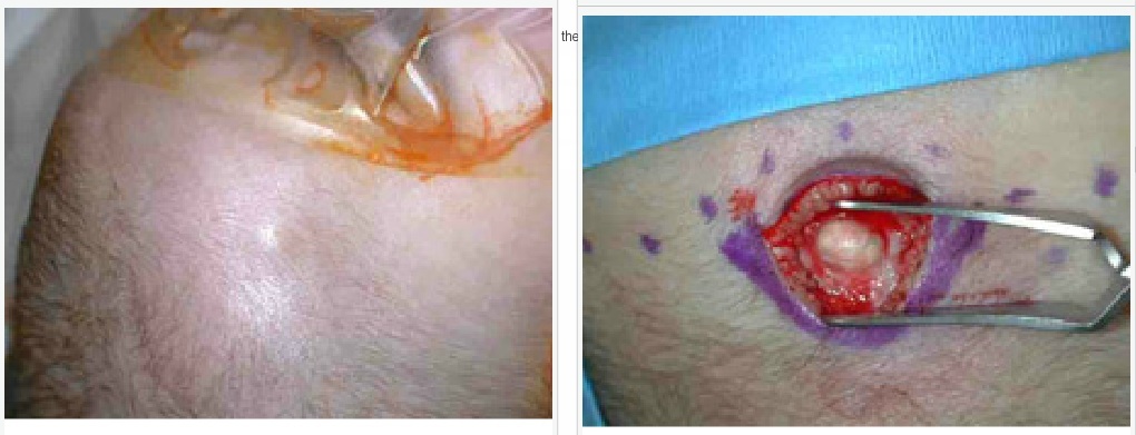 Dermoid cysts are the most common congenital lesion of the scalp and calvarium encountered by the pediatric neurosurgeon. They result from failure of dysjunction of the cutaneous and neuroectoderm and contain epithelium, hair follicles, sebaceous glands, and other cutaneous elements (Figure 1). Nasal and midline sub-occipital (inion) dermoid cysts are more likely to be associated with a small overlying pit or tract and have a higher risk of intracranial and intradural extension (generally between the leaves of the falx cerebri or falx cerebelli, respectively). Extracranial cysts present as palpable or enlarging lumps (Figure 2), or with local infection. Cysts with intracranial extension may also present due to recurring meningitis or, rarely, with intracranial mass effect. The treatment in all cases is surgical extirpation.