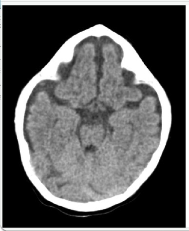 Hasil CT Scan aksial kepala tanpa kontras pada neonatus yang terlihat pada gambar menunjukkan kelainan deformitas yang disebut :