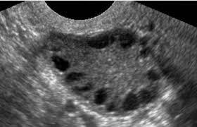 Pelo acúmulo de folículos antrais em fase de maturação bloqueada, dispostos perifericamente (‘colar de pérolas’) e aumento do volume ovariano.