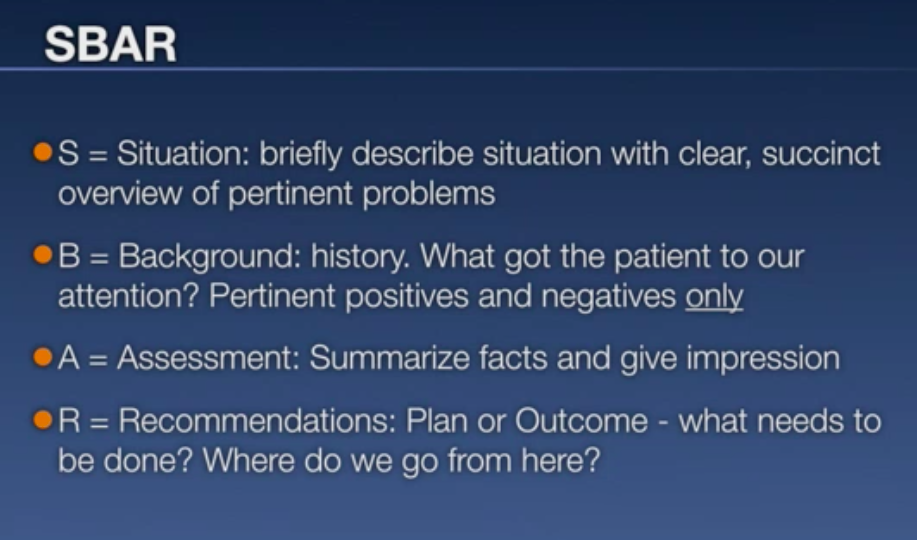 Critical content to communicate to the receiver during a hand-off should include: • Sender contact information • Illness assessment, including severity • Patient summary, including events leading up to illness or admission, hospital course, ongoing assessment, and plan of care • To-do action list • Contingency plans • Allergy list • Code status • Medication list • Dated laboratory tests • Dated vital signs