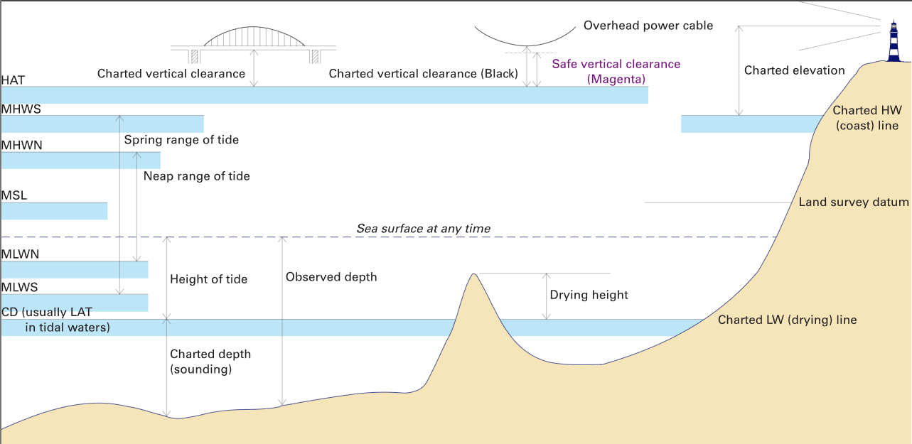 With the help of a neat and labelled diagram, define the various tidal definitions such as MHWS, MLWS, MHWN, MLWN, drying height etc.