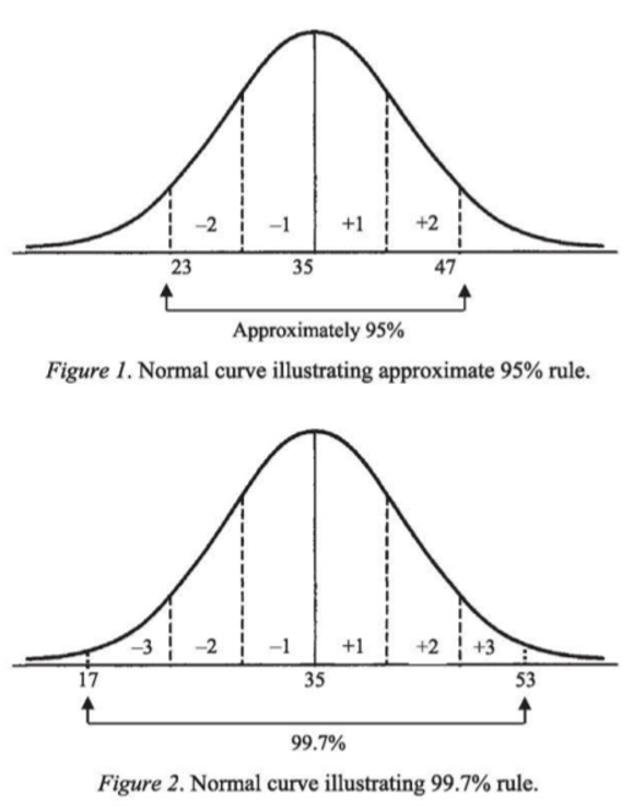 95% RULE – 95% of the scores lie within TWO STANDARD DEVIATION from the MEAN in a NORMAL DISTRIBUTION