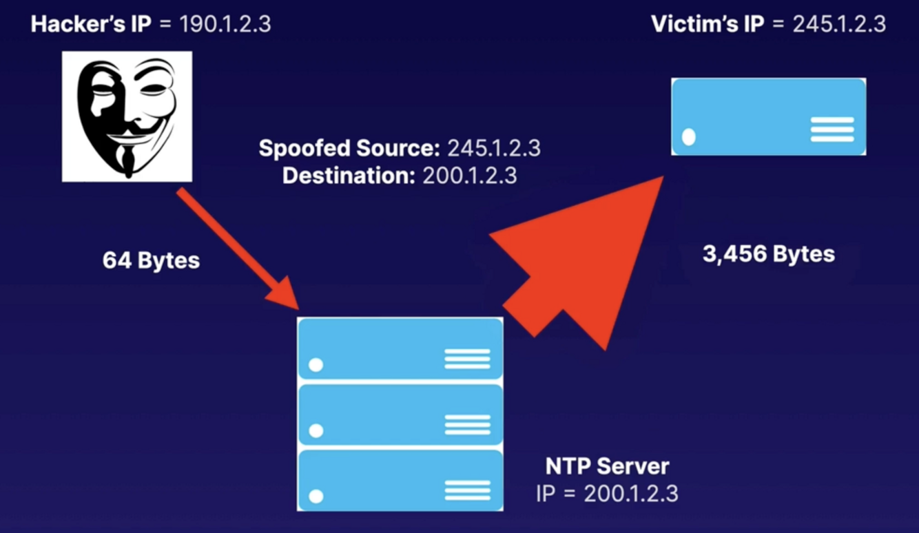 This means the attacker sends a packet with a spoofed IP address of 64 bytes, the NTP server would respond with up to 3,456 bytes of traffic.