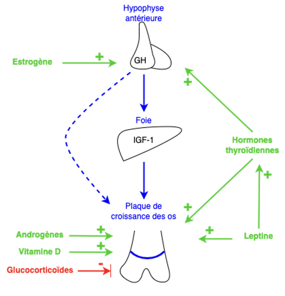 2 hormones & 3 axes (qui comprennent 5 hormones) stimulent la plaque de croissance (PC)