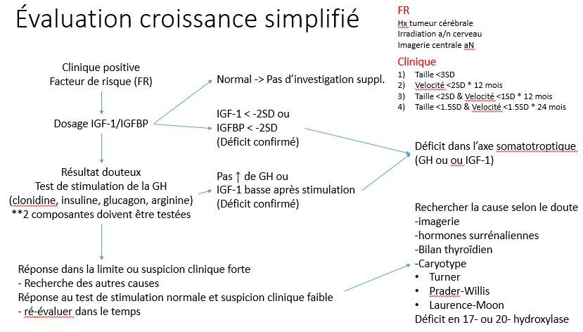 Les dosages pertinents sont IGF-1 et IGFBP dans un premier temps puis la GH lors d’un test de stimulation.