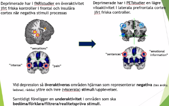 Vad kan man säga generellt om överaktivering och underaktivering i hjärnan vid en depression?