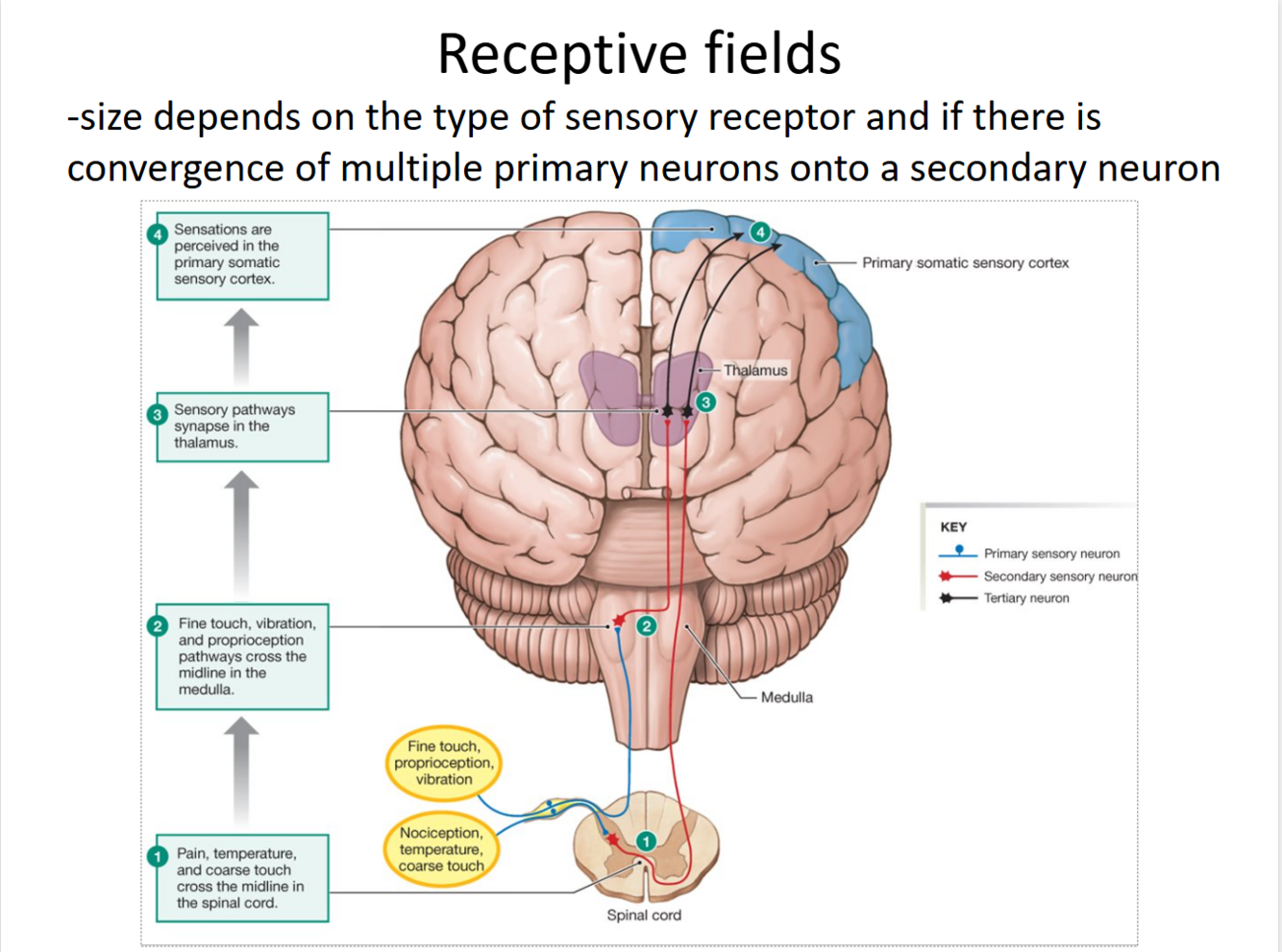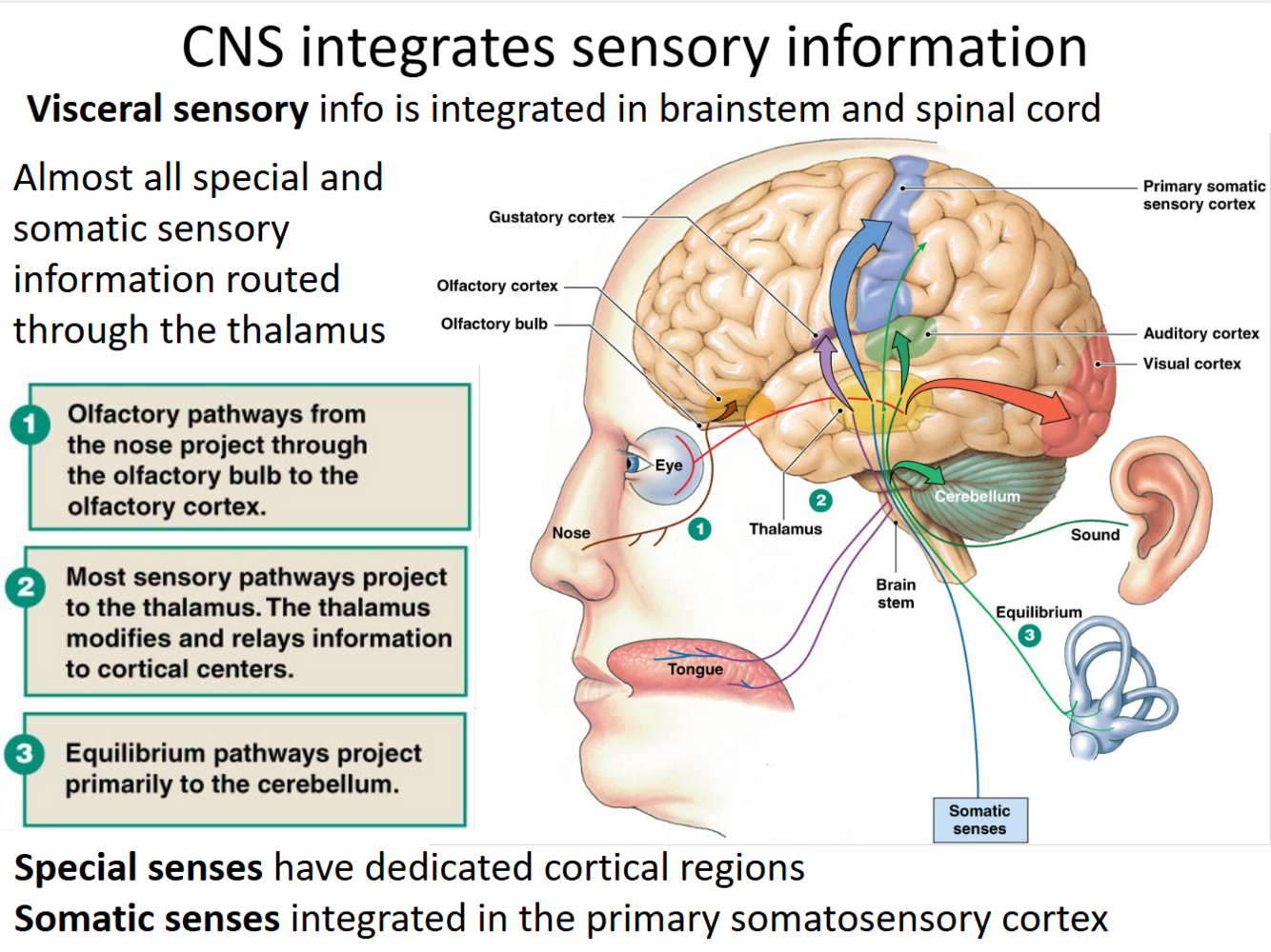 -Each sensory pathway projects to a specific region of the cerebral cortex dedicated to a particular receptive field. The brain can then tell the origin of each incoming signal