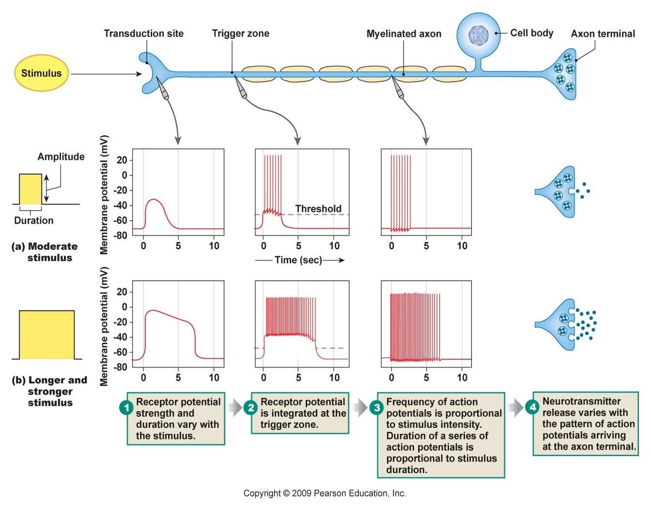 This evokes firing of action potentials for long distance transmission