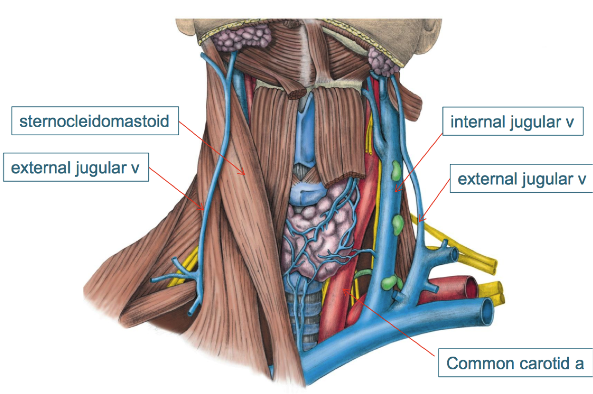 The external jugular vein is superficial to the SCM and the internal jugular vein is underneath.