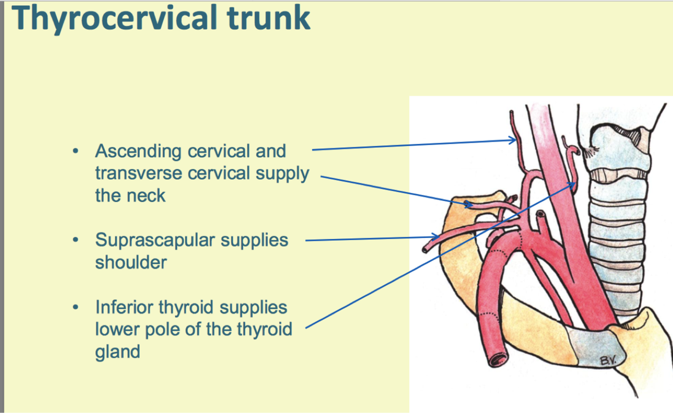 The thyrocervical trunk gives off branches to supply the scapular region and the inferior thyroid artery (which is posterior to the common carotid artery).