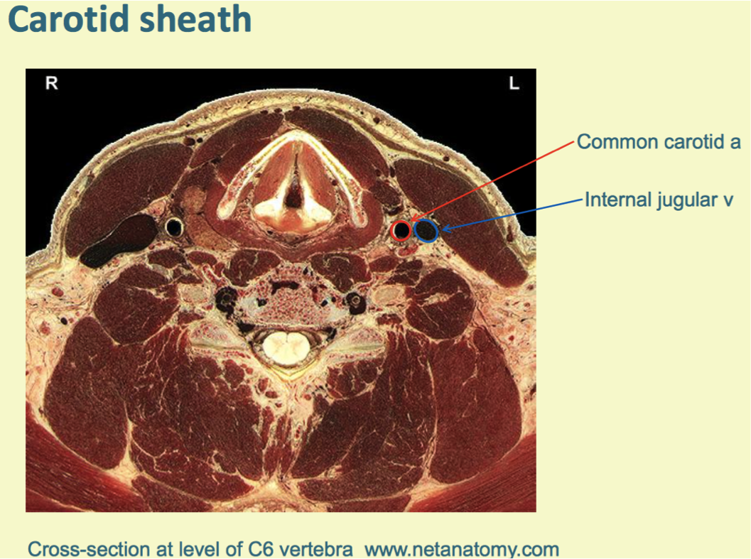 [*] The common carotid artery lies medially within the sheath whilst the internal jugular vein is lateral (mostly under the SCM) and the nerve behind and in between the vessels.