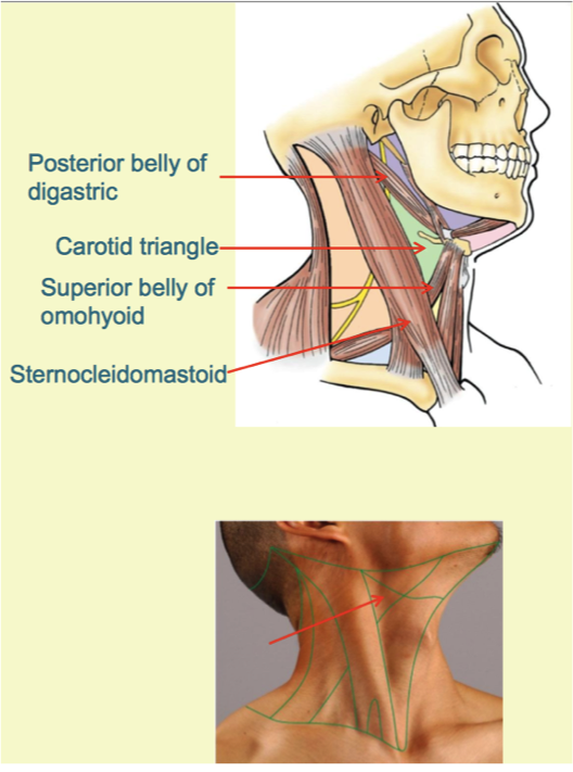 [*] Carotid pulse can be felt in carotid triangle, but may also be palpated more inferiorly by pressing against SCM