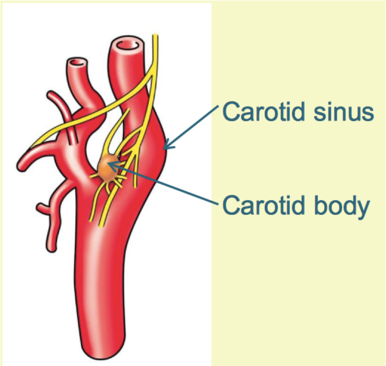 [*] The site of bifurcation of the common carotids (i.e. the carotid sinus) is clinically important because it can be used to alleviate supra-ventricular tachycardia through gentle rubbing (i.e. carotid massage).