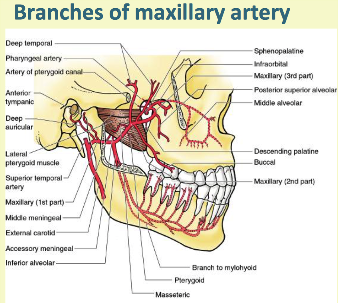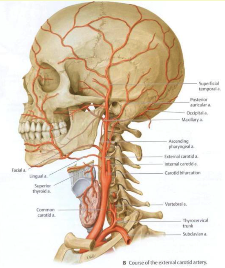 [*] In contrast, the external carotid artery, being the major source of blood supply to extra-cranial structures of the head and neck region, gives rise to 8 branches: