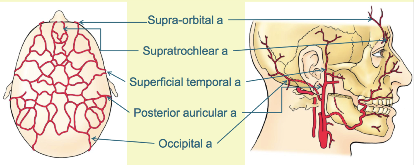 [*] Largely branches of the external carotid artery (superficial temporal, posterior auricular and occipital) except supratrochlear and supraorbital arteries (branches of the ophthalmic artery) which arises from the internal carotid artery.