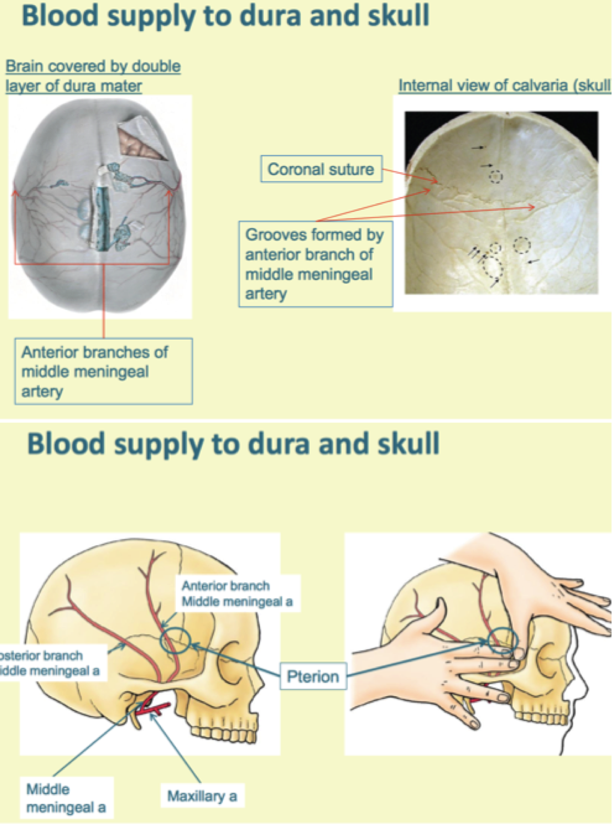 Describe the blood supply to the dura and the skull + the clinical relevance