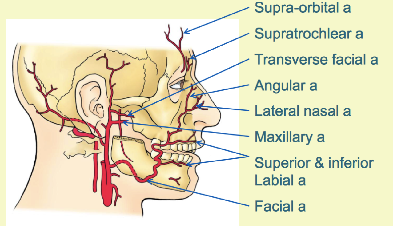 All arise from the external carotid except the supra-orbital and supratrochlear which are from internal carotid artery (via ophthalmic).