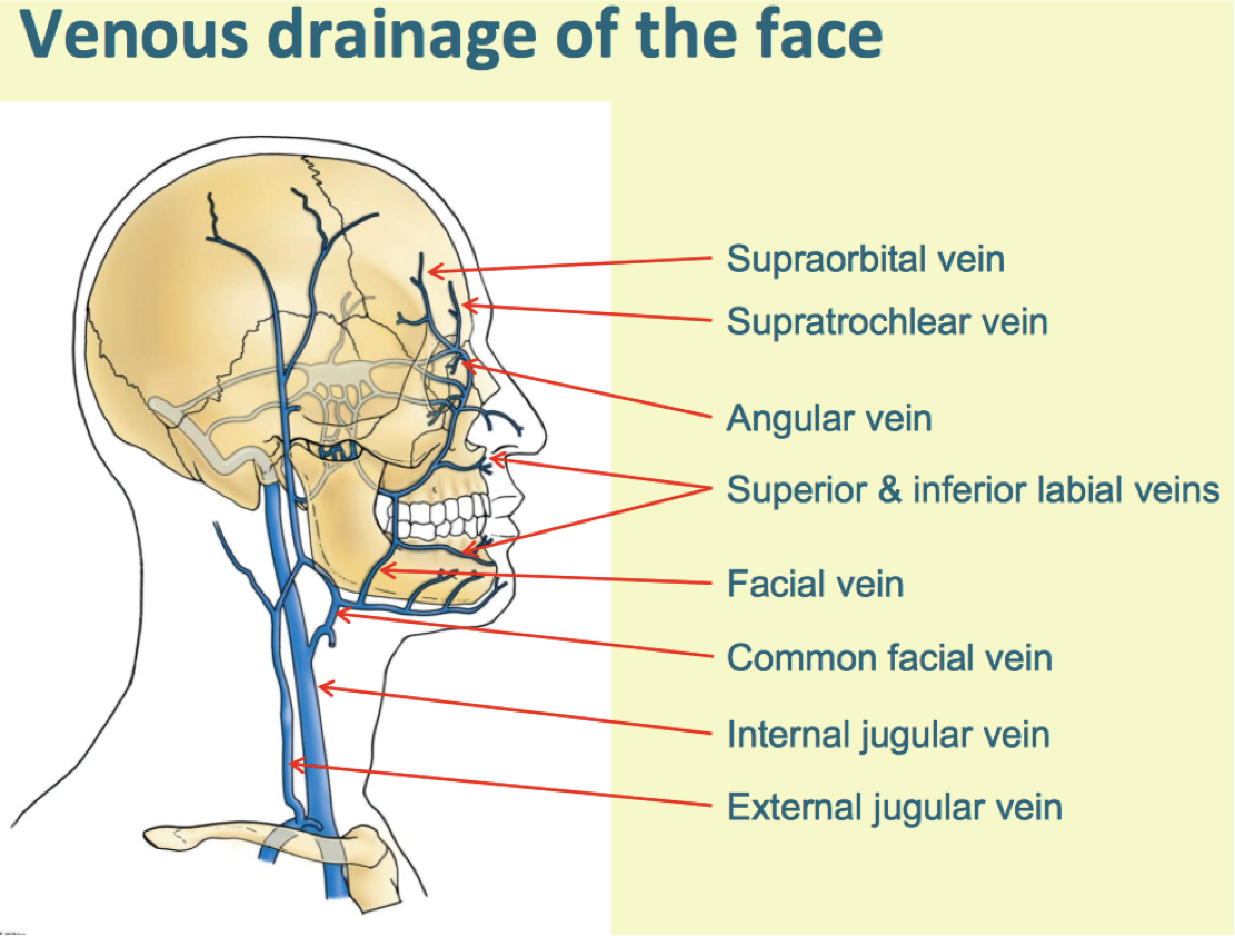 Venous Drainage of the face: the supraorbital, supratrochlear, angular, superior and inferior labial veins all drain into the facial vein which drains into the common facial vein which drains into the internal jugular vein.