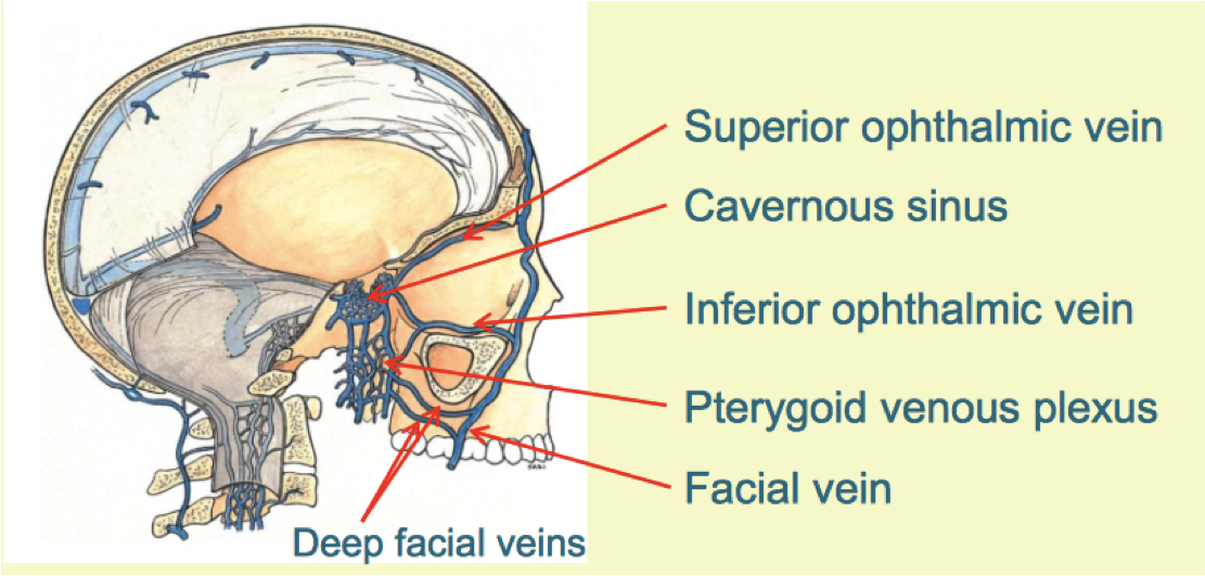 [*] Connection of facial veins with cavernous sinus and pterygoid venous plexus - the pterygoid venous plexus communicates with the cavernous sinus via various foramen such as foramen lacerum and foramen ovale so infection of the superficial face may spread to the cavernous sinus, causing cavernous sinus thrombosis.