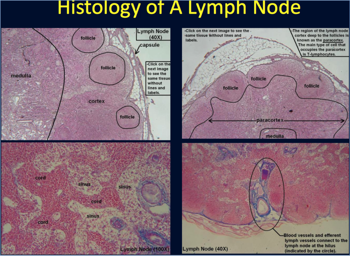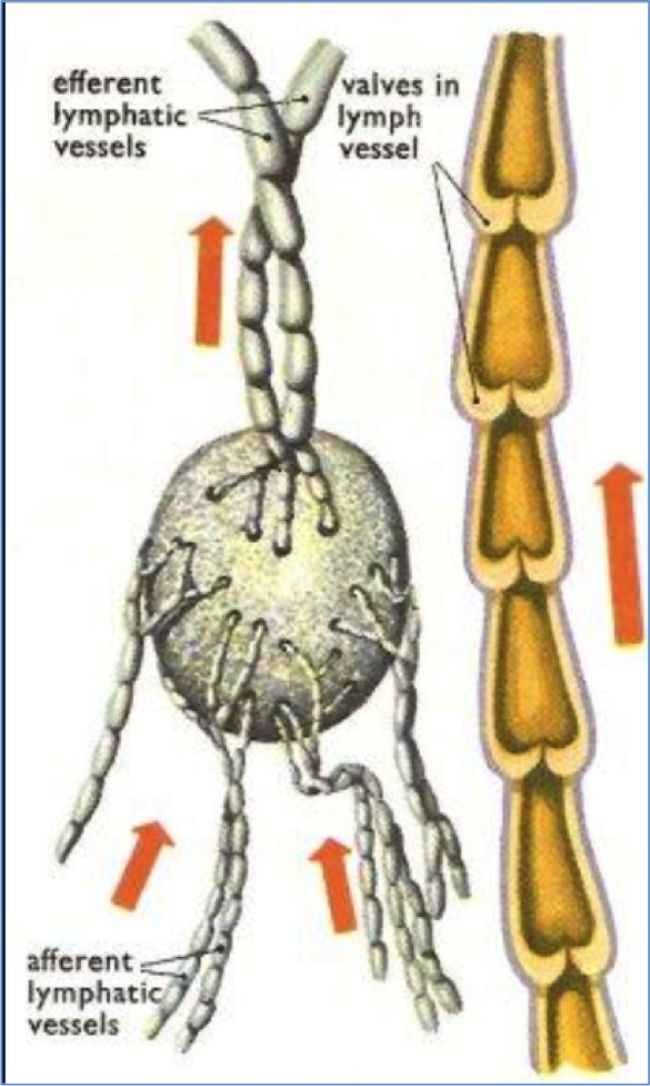 [*] Lymph enters through afferent channels, percolates through the sinuses and leaves through the efferent channel; lymph nodes act as a filter for the fluid – remove lymph and other debris.